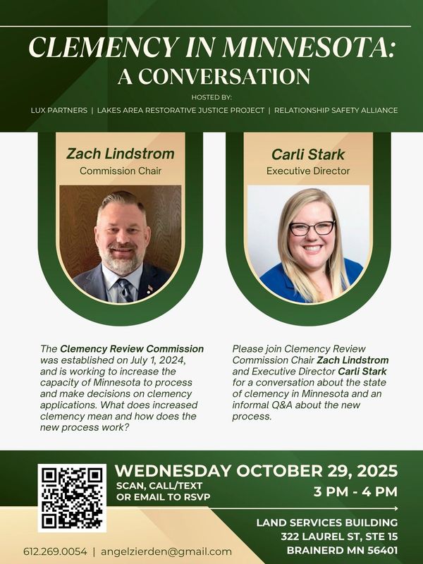 Please join Clemency Review Commission Chair Zach Lindstrom and Executive Director Carli Stark for a conversation about the state of clemency in Minnesota and an informal Q&A about the new process.
